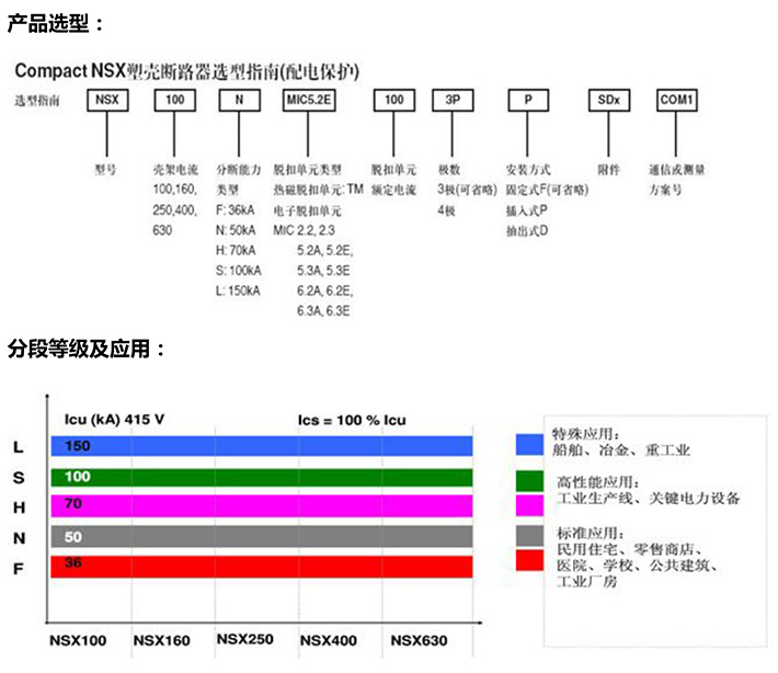 NSX系列塑料外殼式斷路器其額定絕緣電壓為950V,適用于交流50Hz或(60Hz),額定工作電壓690V及以下,額定工作電流12.5A至630A的電流中,用來分配電能,在正常條件下做不頻繁的閉合和斷開之用,并在線路和設(shè)備過載、欠電壓時起保護作用。額定殼架等級電流在400A及以下的斷路器,也可作鼠籠型電動機的不頻繁起動,運轉(zhuǎn)中斷開以及在電動機過載,短路及欠電壓時起保護作用。